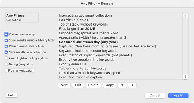 To enable reasonably fast searching, Any Filter uses Lightroom’s built-in search facilities wherever possible. But Lightroom has numerous obscure bugs in its search. If you suspect you’re encountering such a bug, use the Avoid Lightroom bugs option. This will avoid the bugs, at the expense of much slower searching.