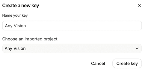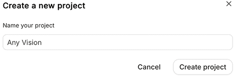 - Click the Choose an imported project drop-down menu, select Create project, enter “Any Vision”, click Create project, and select “Any Vision” as the project: